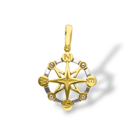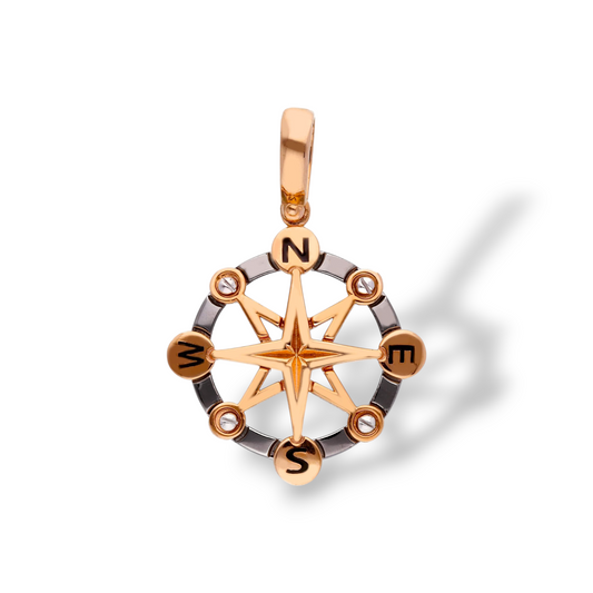 Gold pendant in the shape of a nautical compass with diamonds and fired enamel