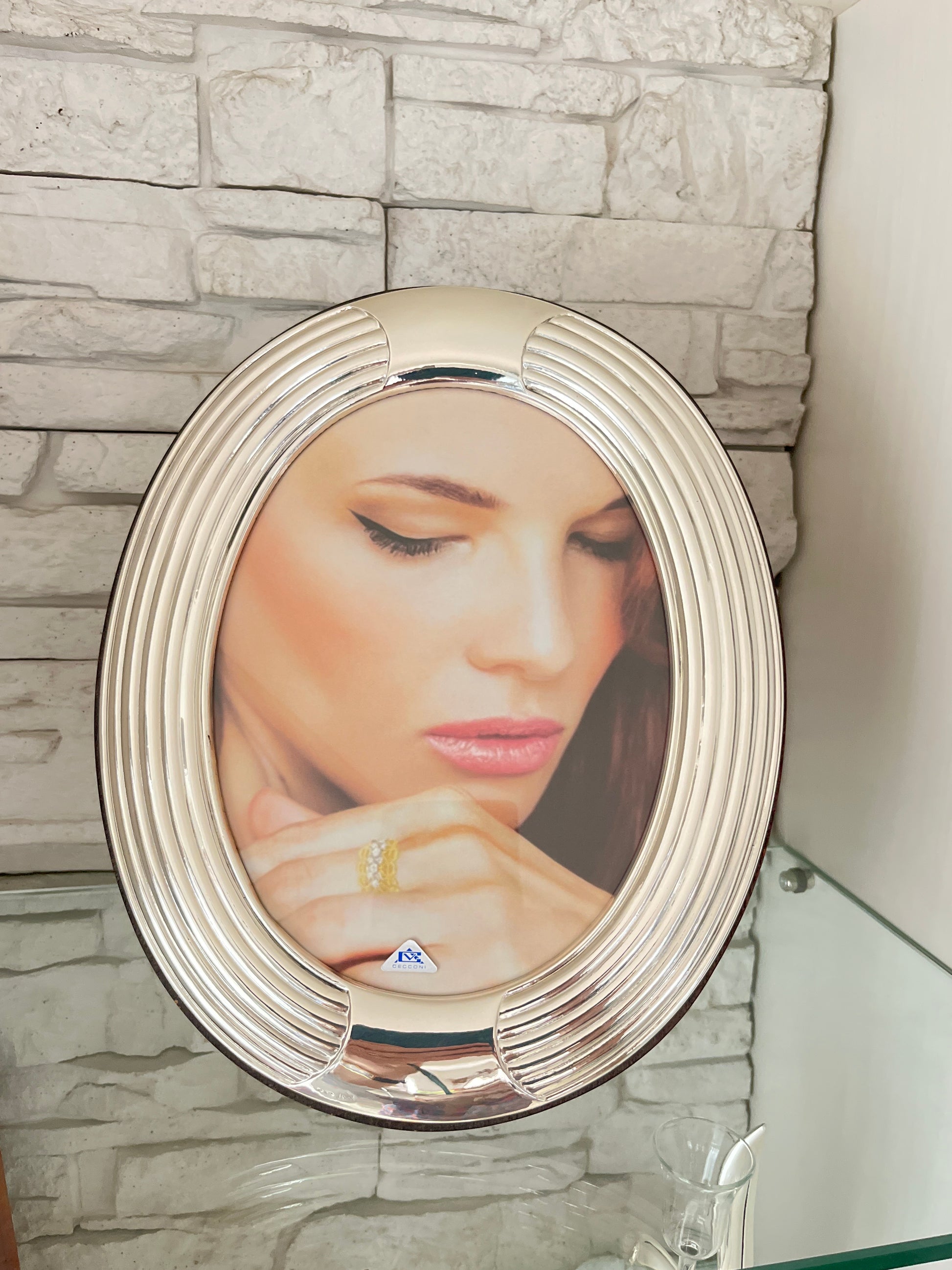 Bilaminated oval silver photo frame, with wide striped pattern and lacquered wooden back.