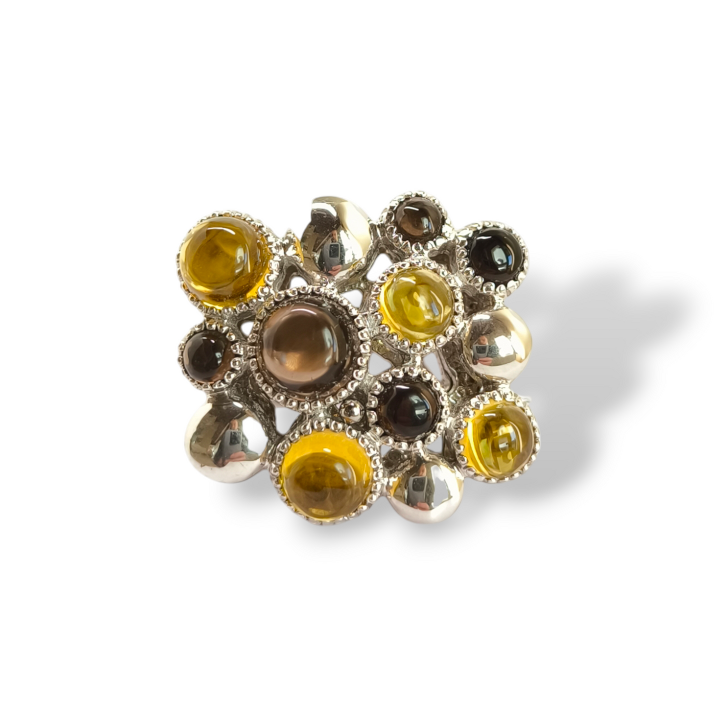 gambo a fascia alta con al centro motivo fantasia in quarzi citrini e madera taglio cabochon tondo incastonati a battuta