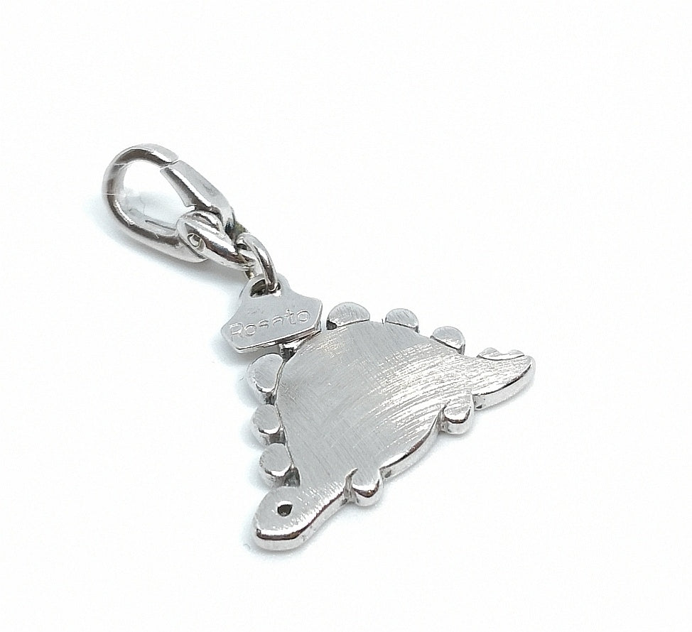 Ciondolo in argento con diamante incassato, decorato con smalti a fuoco, soggetto Dinosauro.