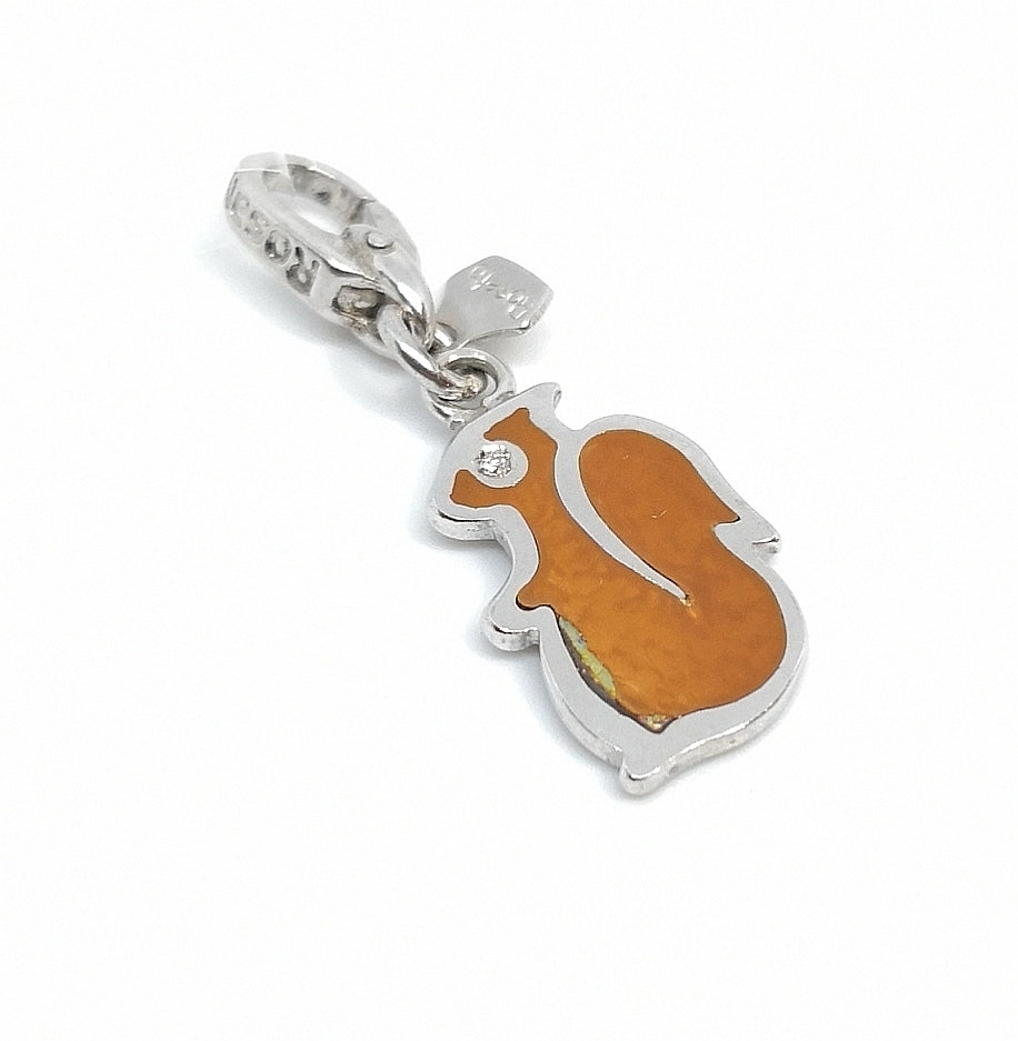 Ciondolo in argento con diamante incassato, decorato con smalti a fuoco, soggetto Scoiattolo.
