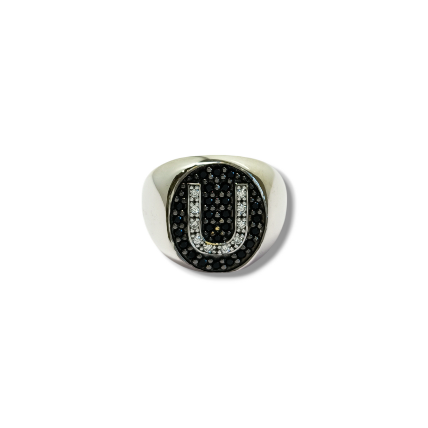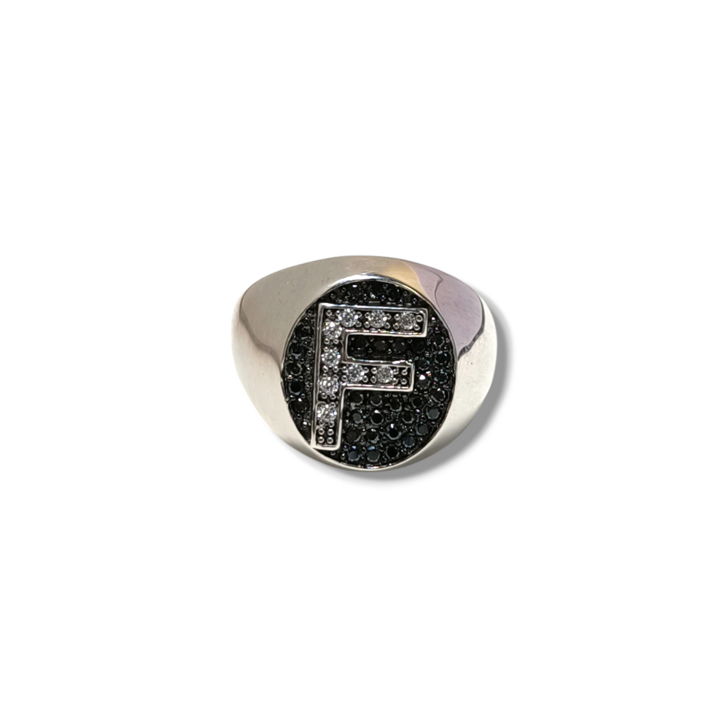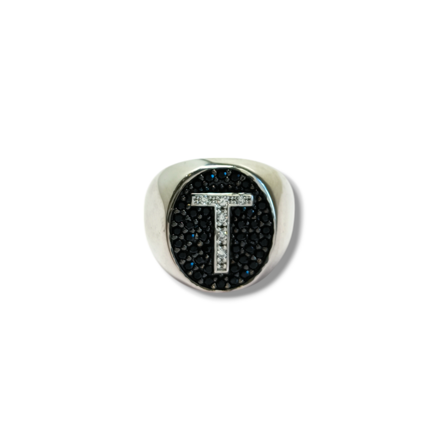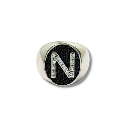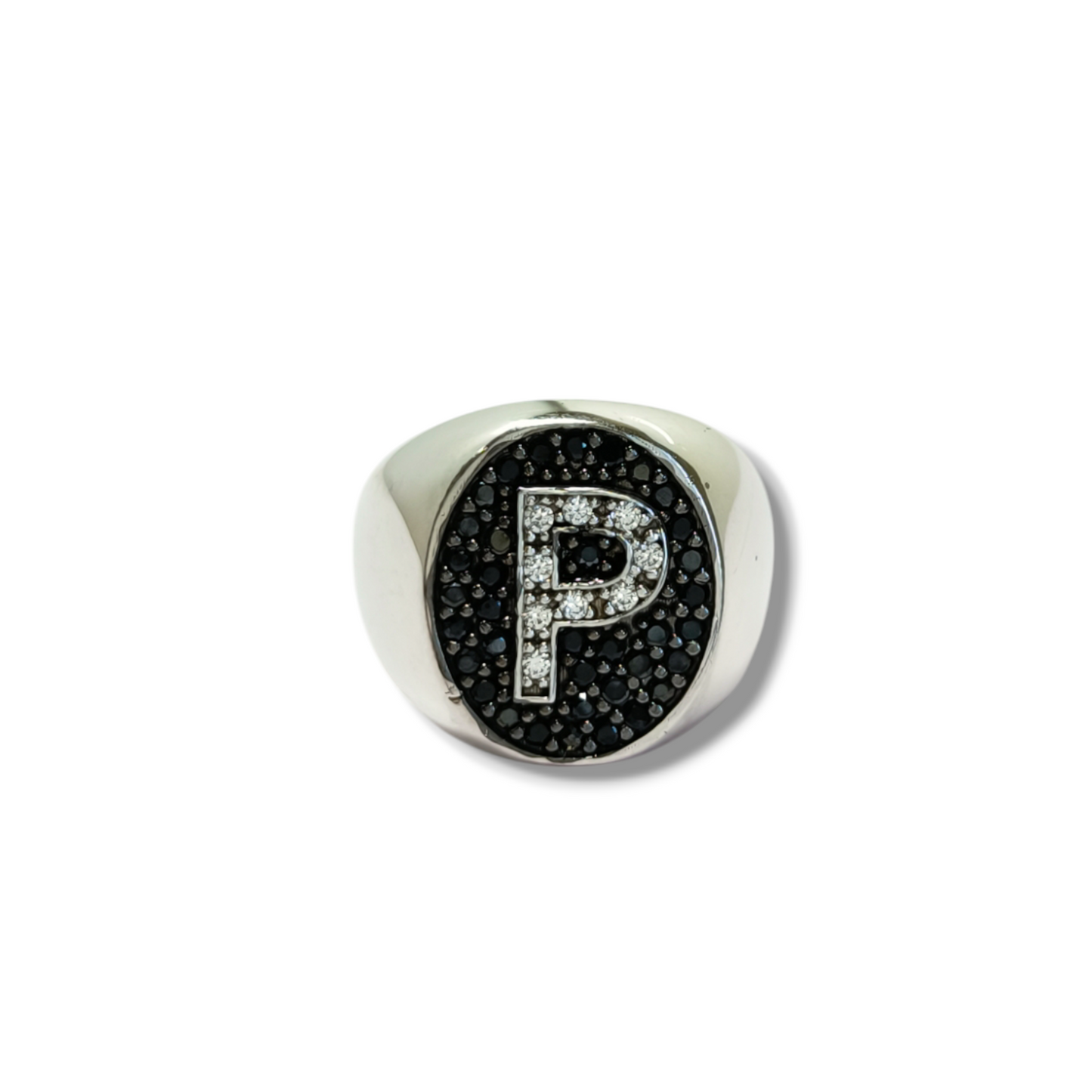 Lettera in zirconi bianchi a pavé, e contorno a pavé di zirconi neri