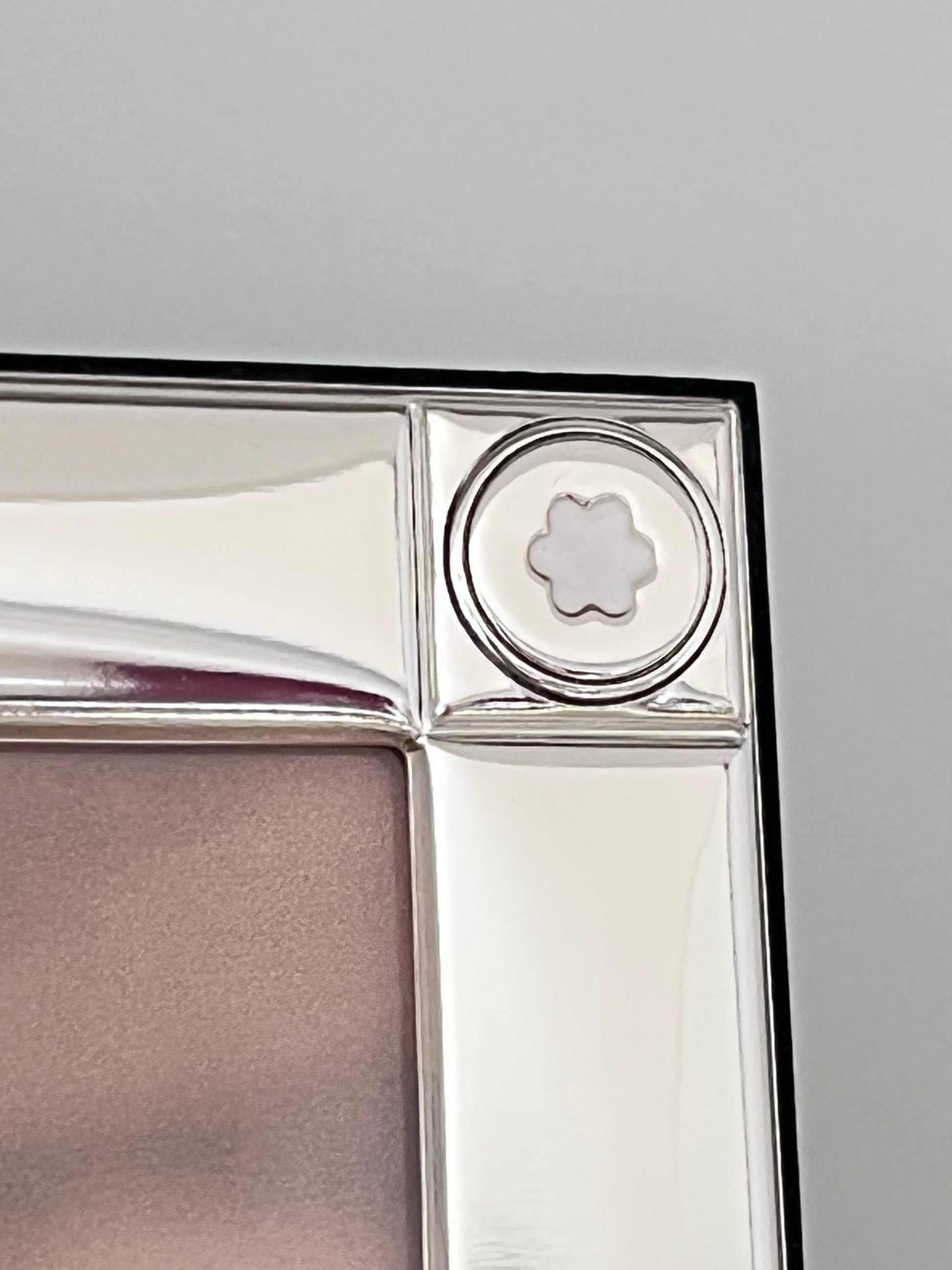 Cornice in argento bilaminato, misura fotografia centimetri 13 × 18, retro in legno, decorazione con fiore in smalto bianco.