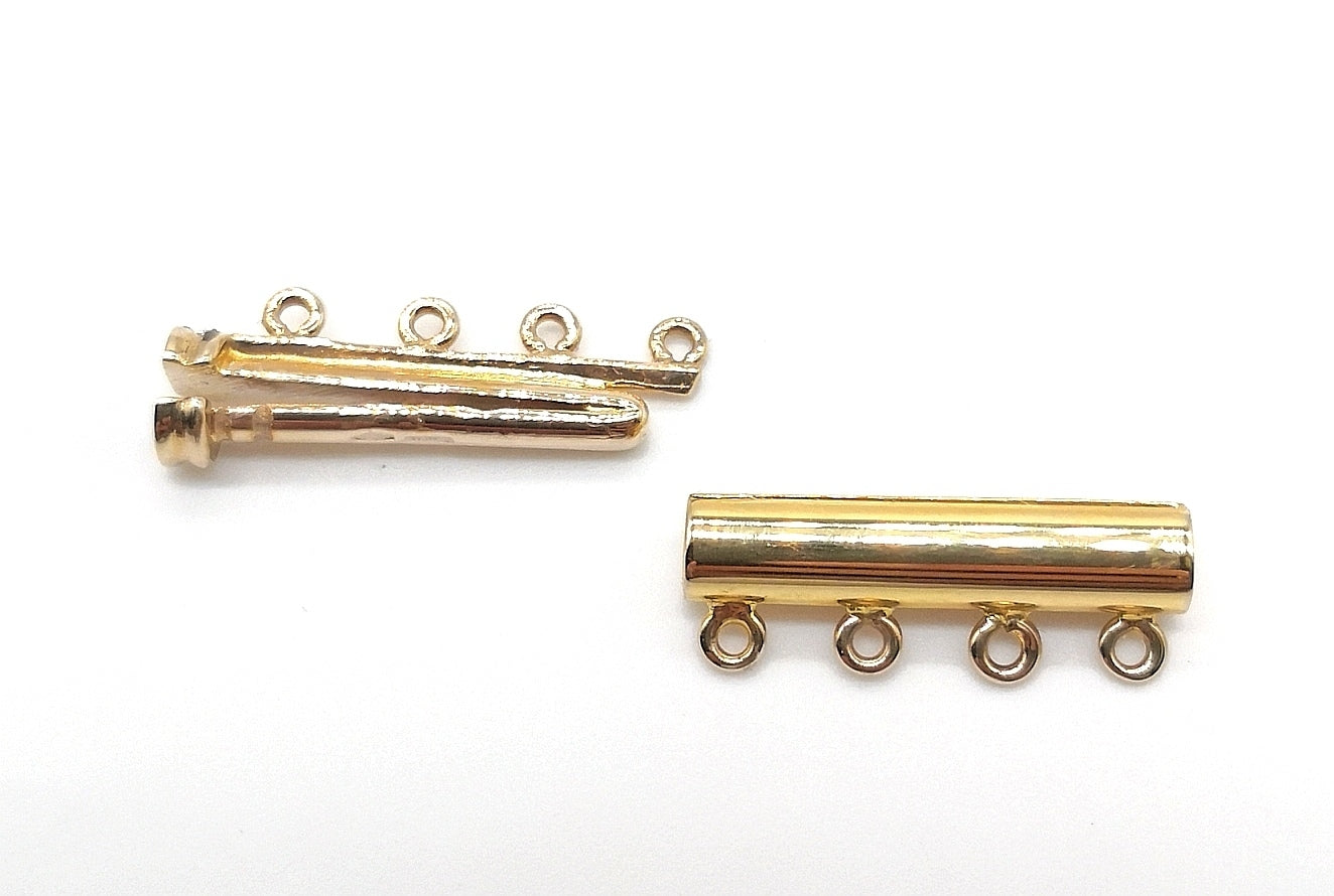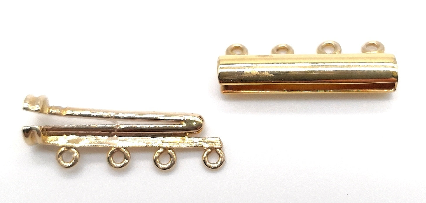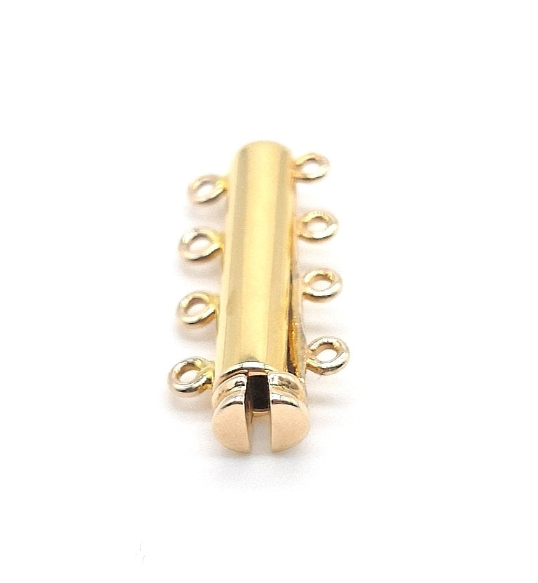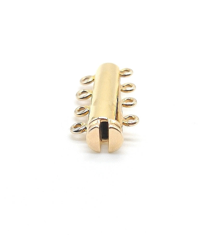Chiusura in oro, a bacchetta, con 8 anelli per affrancare i file della collana, 4 per ciascun lato, saldati al bariletto ed allo scivolo a scomparsa.