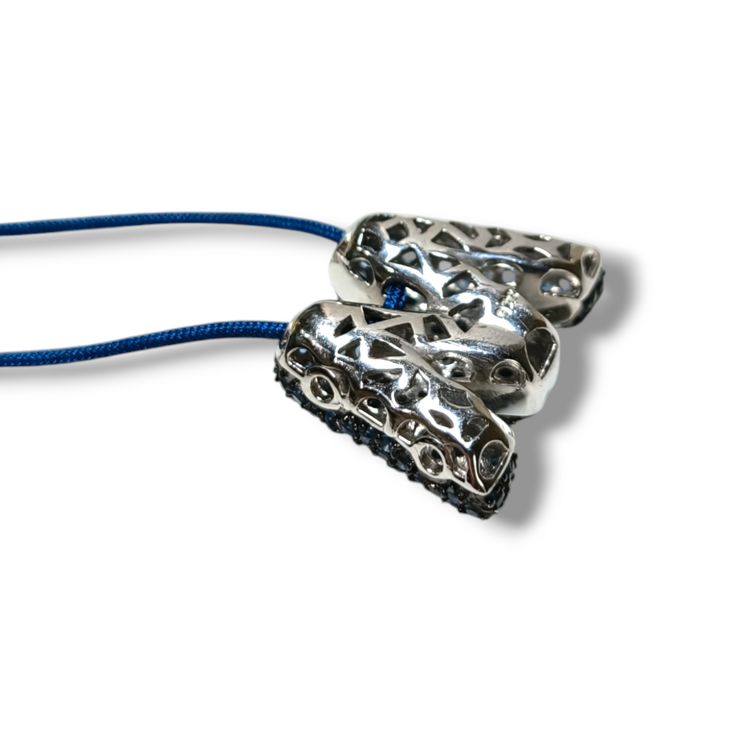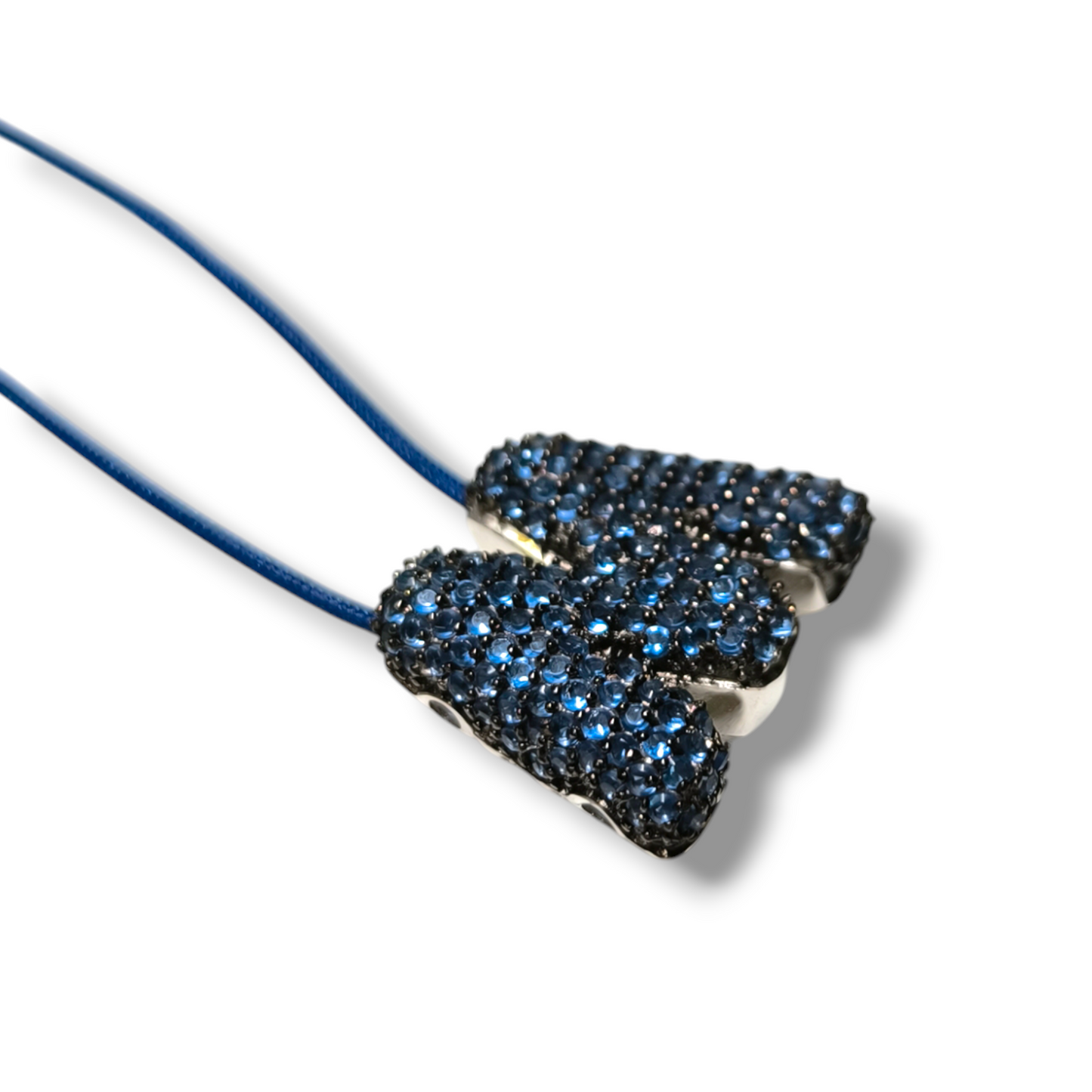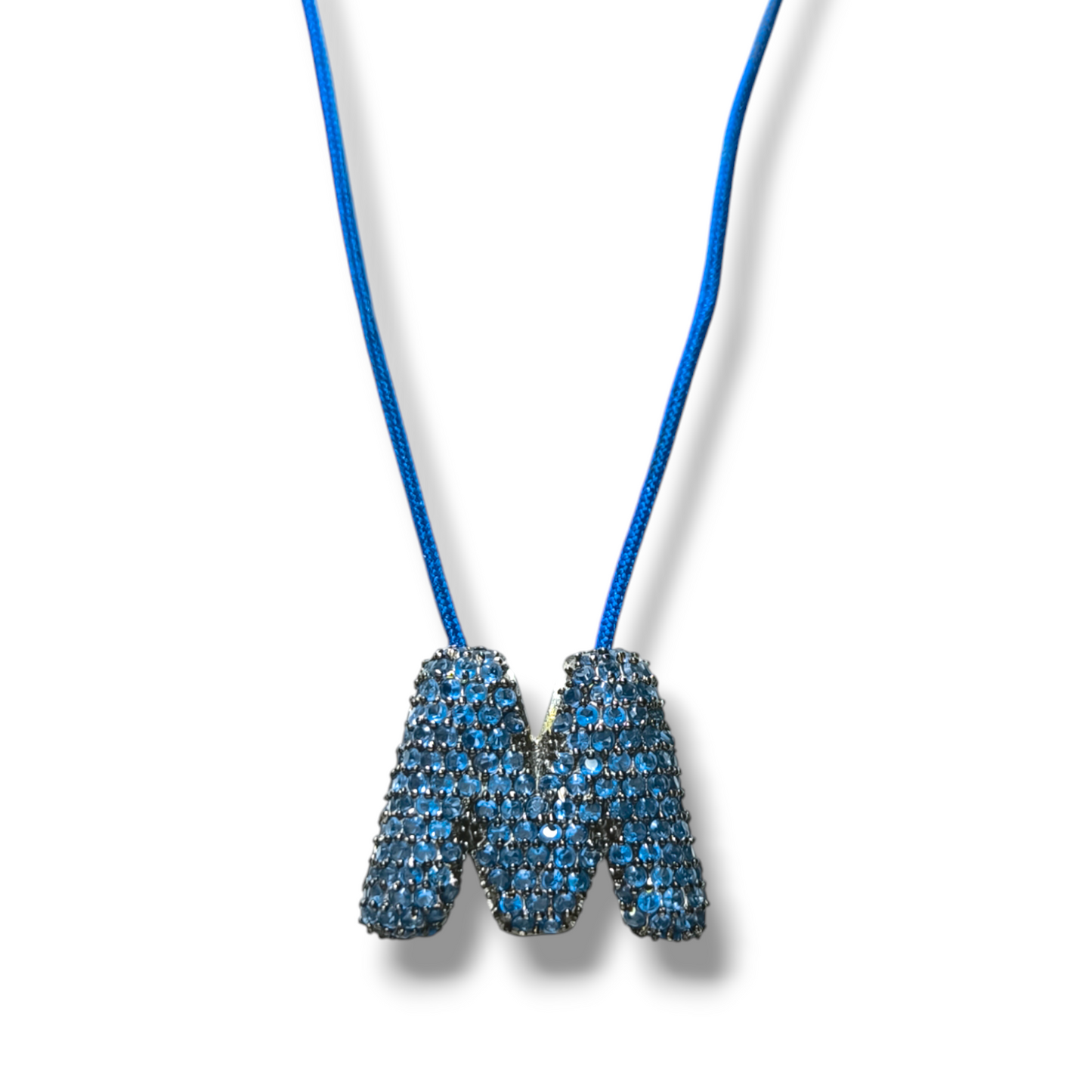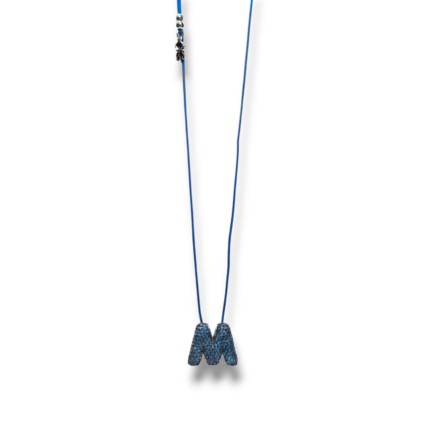 Lettera M fissa al centro in argento e zirconi blu incassati a mano