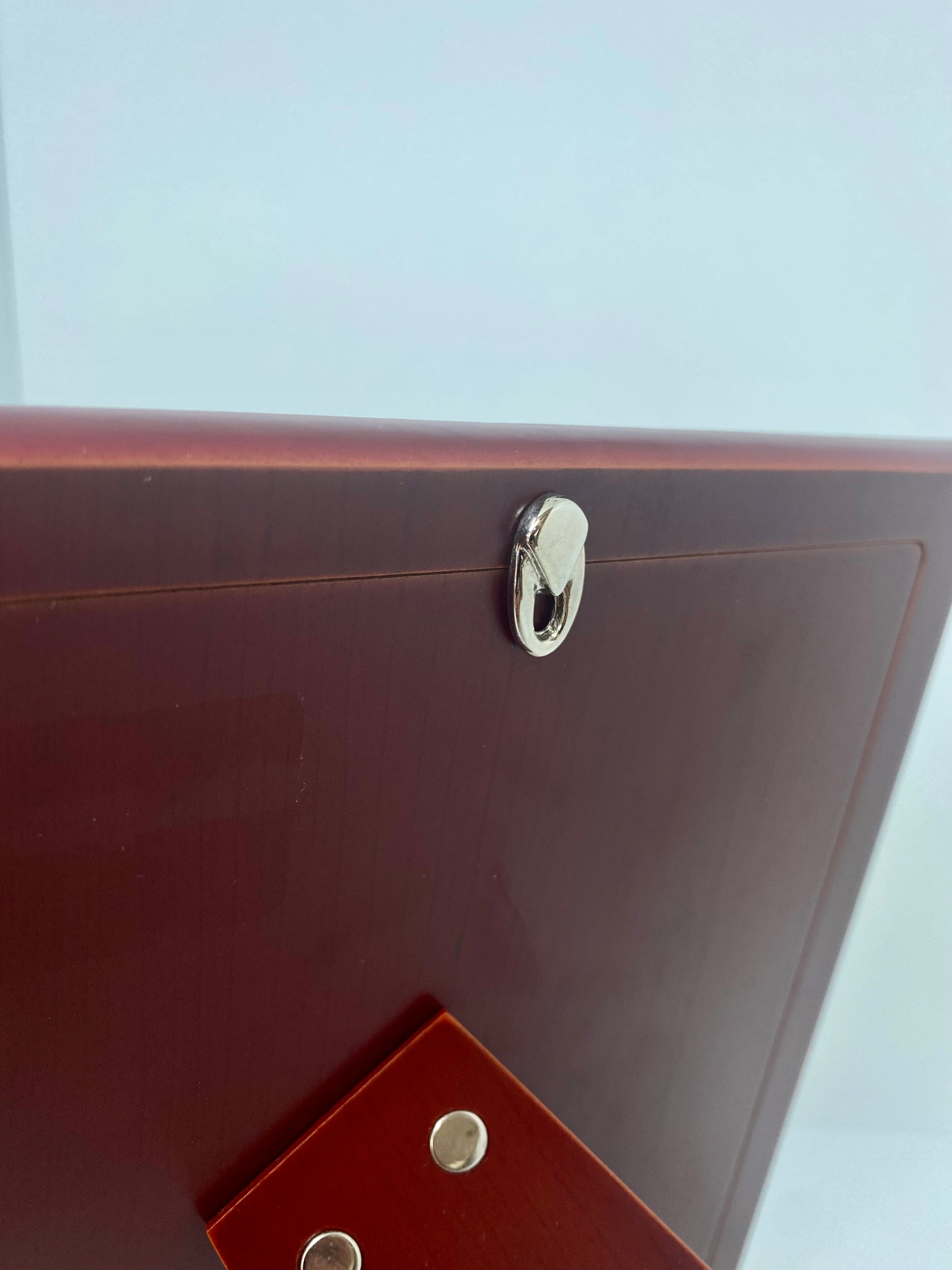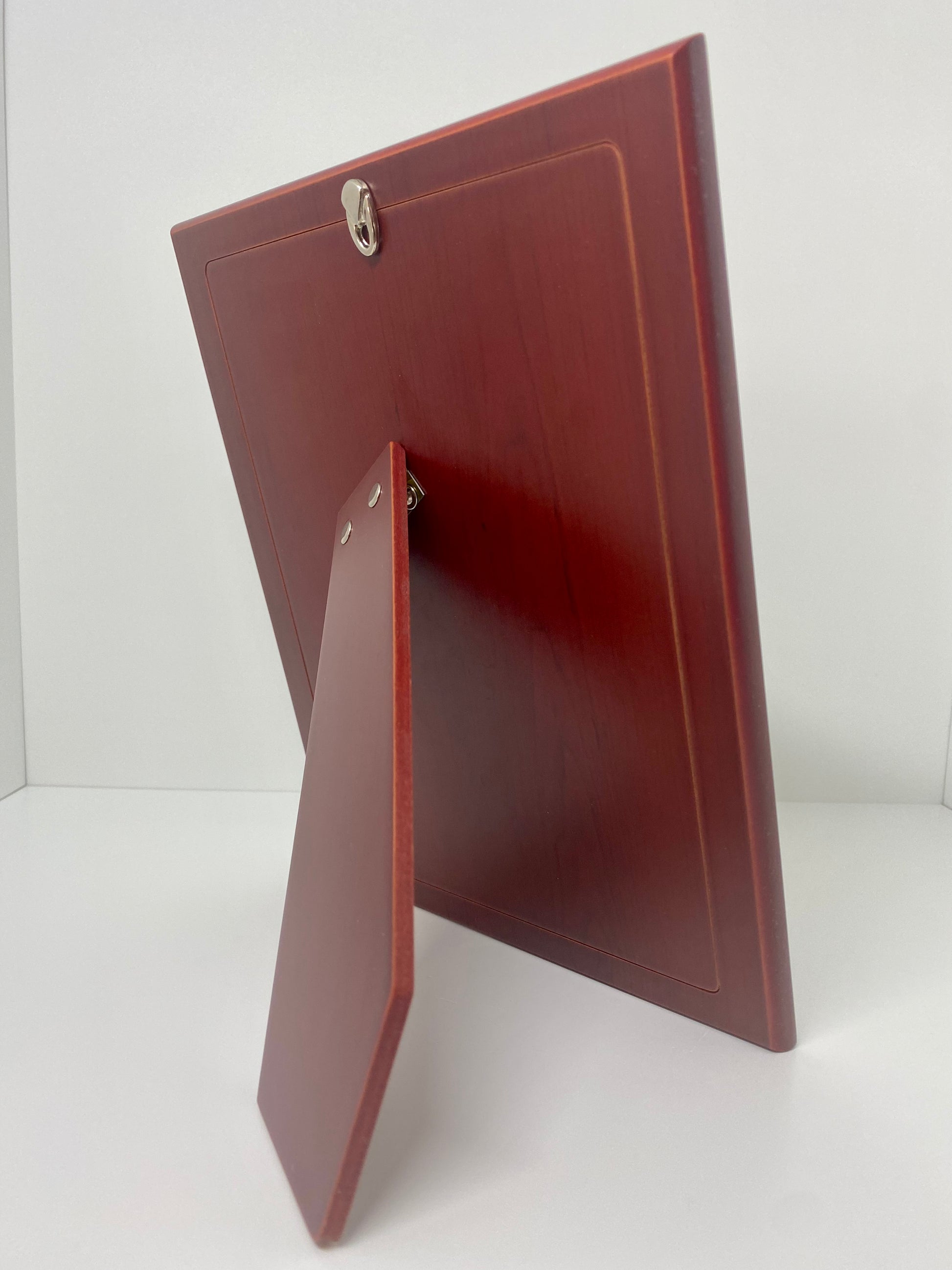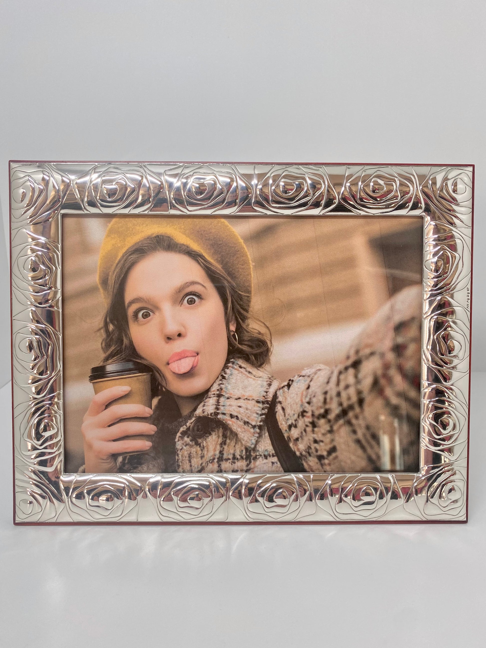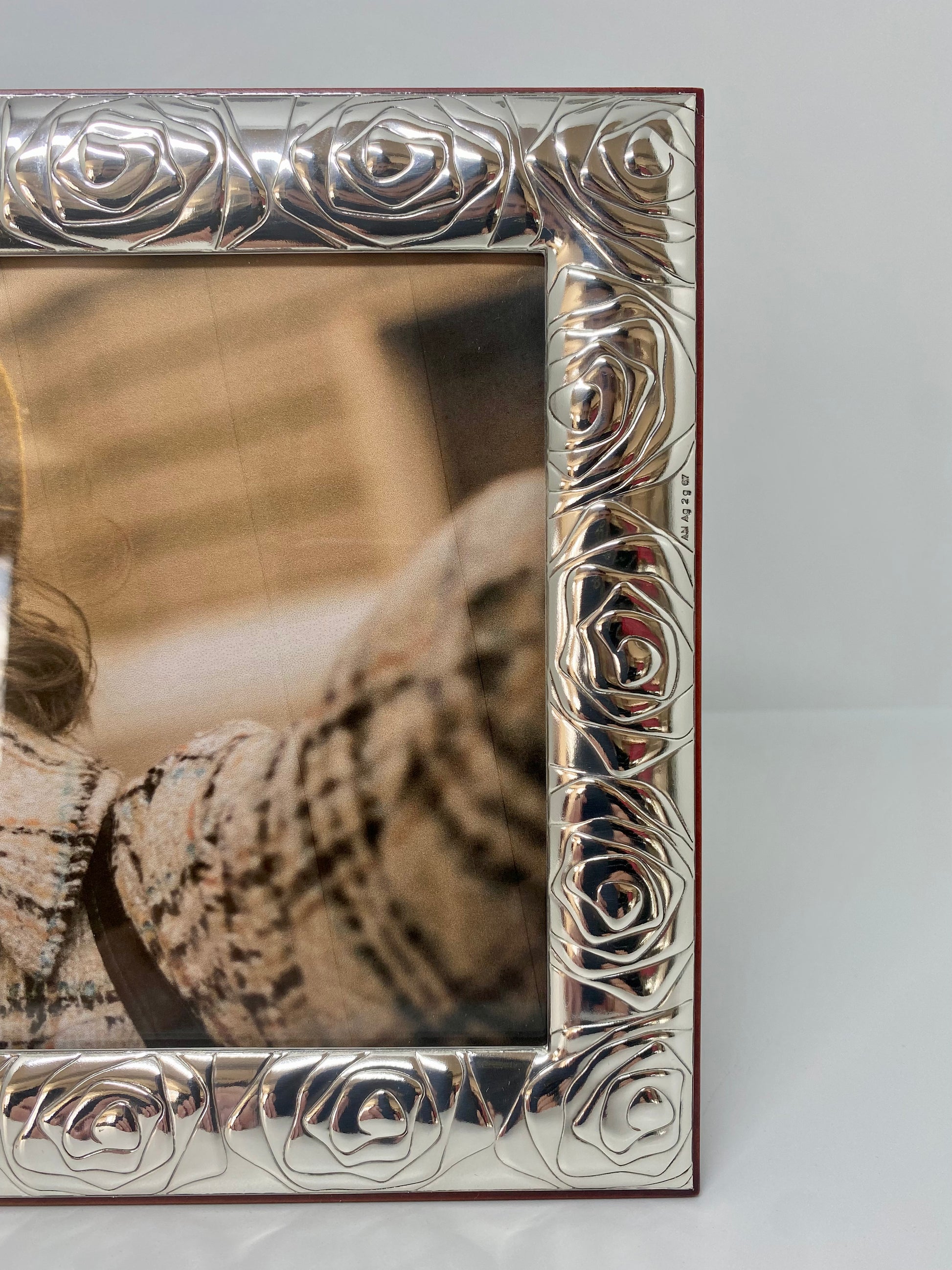 Portafoto Bilaminato in argento con motivo a Rose e retro in legno laccato lucido.