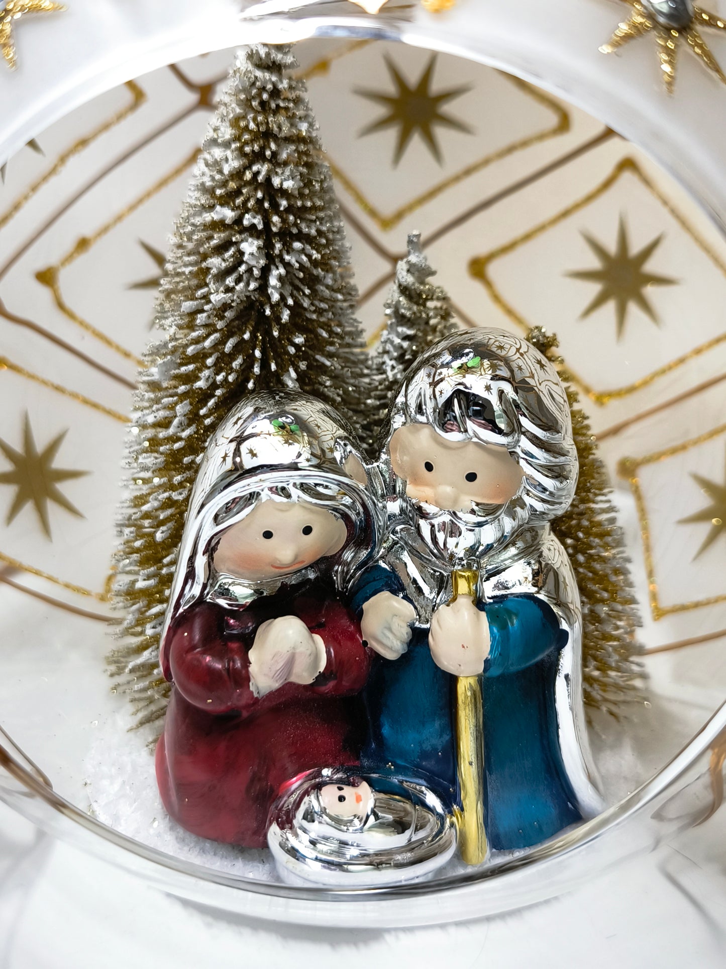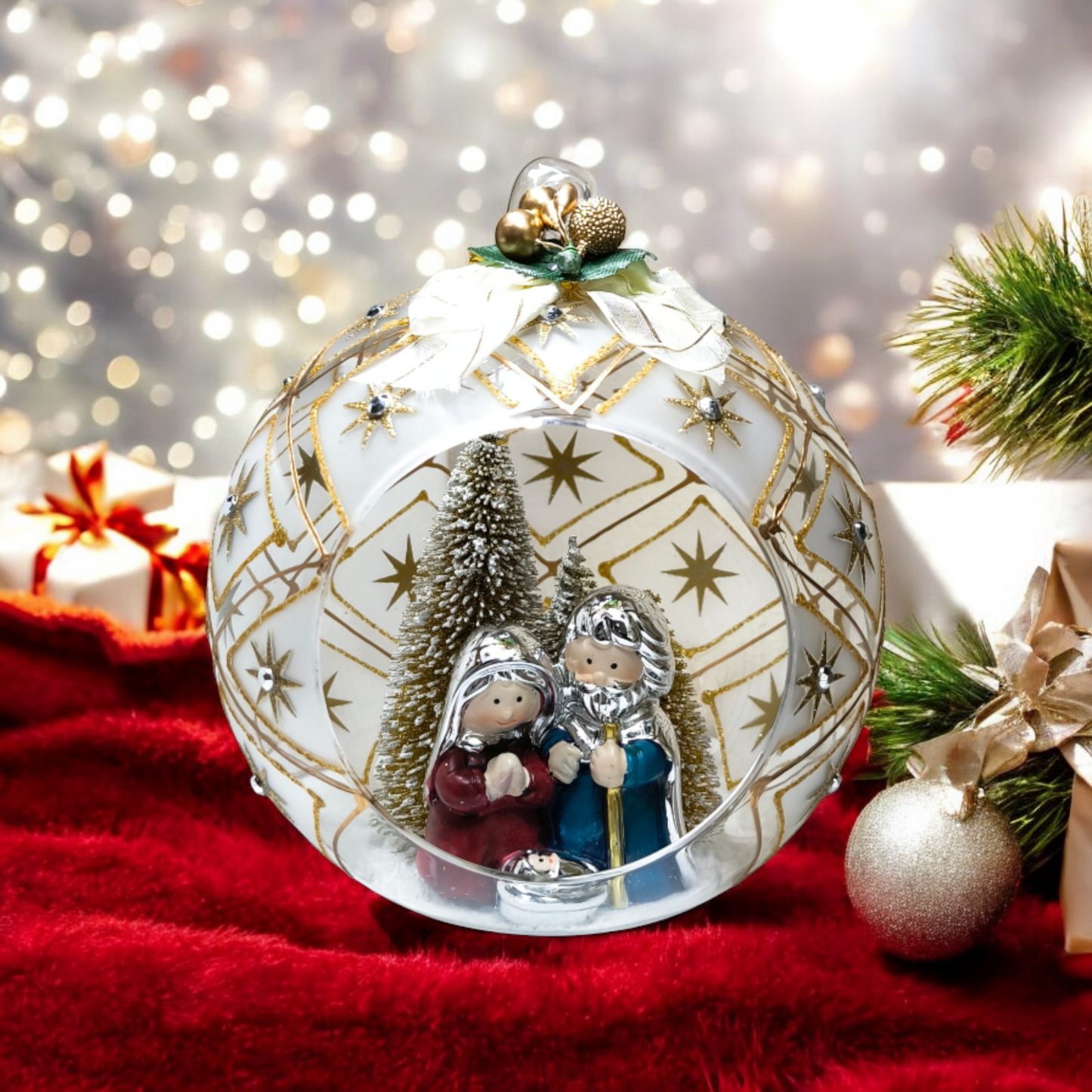 Presepe a sfera di cristallo lavorata con pietre e decori
